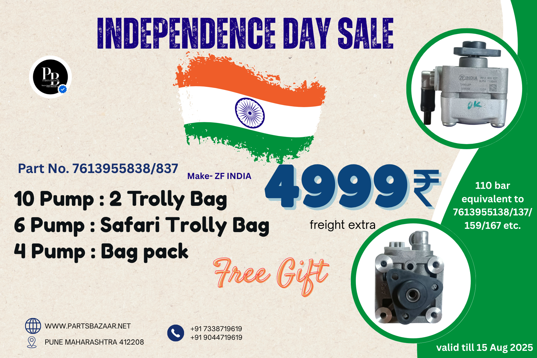offer on Vane Pump 7613955138, make ZF India, free earbuds.